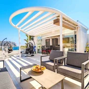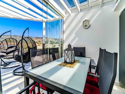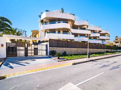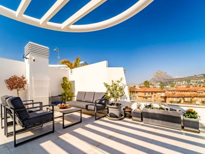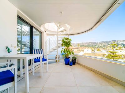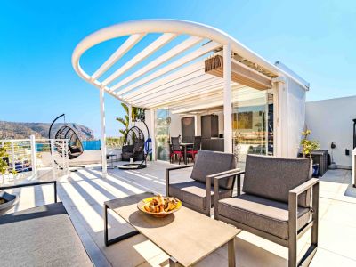 Ubicado en el prestigioso complejo Brezza Residencial en Jávea, este dúplex de diseño contemporáneo ofrece una experiencia de vida mediterránea excepcional. La propiedad destaca por su arquitectura vanguardista de líneas curvas y espacios luminosos que se integran perfectamente con el entorno costero. La joya de la corona es su amplia terraza solárium privada en la planta superior, equipada con una pérgola de diseño, zona de comedor exterior, áreas de descanso con sillones colgantes y un jacuzzi privado desde donde se puede disfrutar de vistas panorámicas al mar y al emblemático monte Montgó.