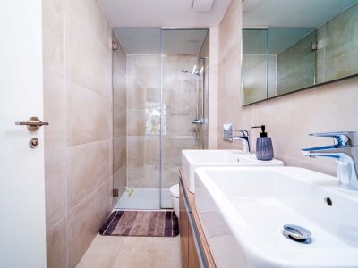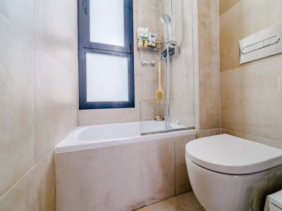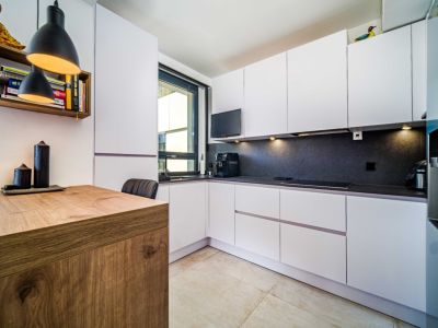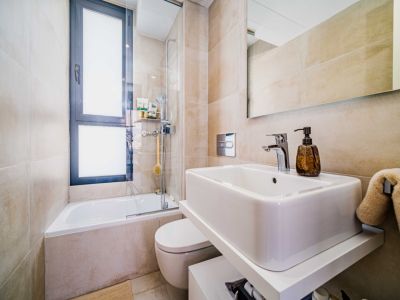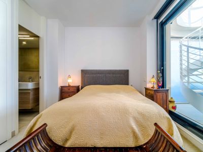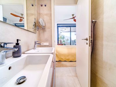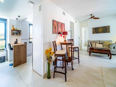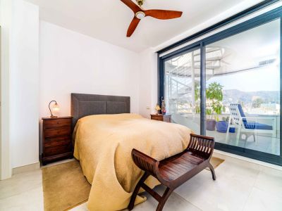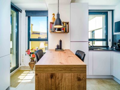 El interior se distribuye en dos niveles conectados por una elegante escalera de caracol exterior y accesos internos. La zona de día cuenta con un salón-comedor de concepto abierto que se abre a una terraza cubierta con barandillas de cristal para maximizar las vistas. La cocina, de estilo minimalista, está totalmente equipada con mobiliario blanco de alta calidad, encimeras oscuras y una funcional barra de desayuno con acabado en madera. Los dormitorios son amplios y luminosos, equipados con armarios empotrados y acceso directo a las zonas exteriores. Los baños presentan un acabado moderno con materiales de primera calidad, incluyendo duchas a ras de suelo y sanitarios suspendidos.