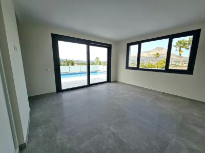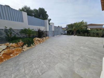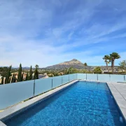 El exterior de la villa está concebido para la relajación y el disfrute del clima local. Una amplia terraza pavimentada rodea la piscina privada, que cuenta con barandillas de cristal de seguridad para asegurar que las vistas al monte Montgó permanezcan inalteradas. La parcela está profesionalmente ajardinada con una mezcla de flora mediterránea y zonas de grava de bajo mantenimiento. Para los vehículos, la propiedad dispone de una entrada privada asegurada por un portón eléctrico que conduce a una zona de aparcamiento cubierta protegida por una pérgola de alta calidad.