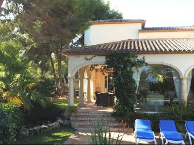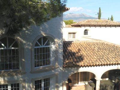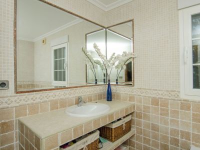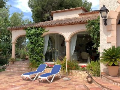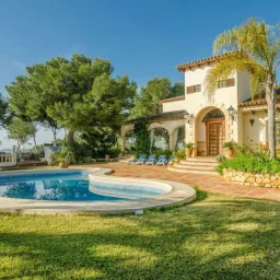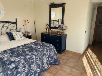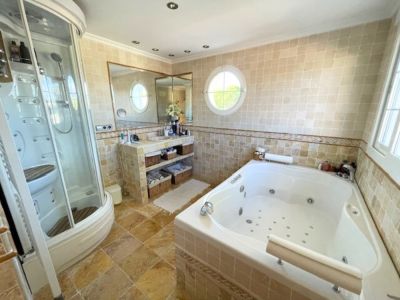 Esta elegante villa de estilo mediterráneo se encuentra en una zona tranquila de L'Alfàs del Pi. La propiedad destaca por su arquitectura tradicional y espacios interiores luminosos. El salón principal cuenta con techos de doble altura y grandes ventanales en arco que inundan la estancia de luz natural, conectando con un comedor formal decorado con una lámpara de diseño. La cocina es amplia, de estilo rústico y está completamente equipada, incluyendo una isla central y zona de desayuno. La zona de descanso ofrece dormitorios confortables, destacando la suite principal con acceso directo a una terraza privada desde donde se puede disfrutar de vistas despejadas hacia el mar Mediterráneo. Los baños están acabados con materiales de calidad, incluyendo una bañera de hidromasaje y ducha independiente.