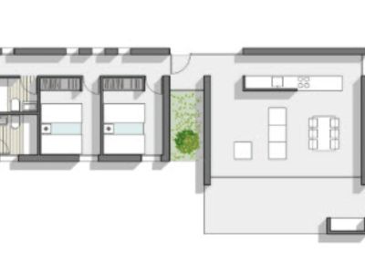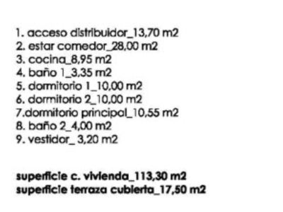 La distribución interior, toda en una planta, cuenta con un amplio salón-comedor que se abre directamente a una terraza cubierta de 17,50 m², ideal para disfrutar del clima local. La cocina es de concepto abierto, integrándose perfectamente en la zona social. La zona de descanso incluye un dormitorio principal con vestidor y baño en-suite, además de dos dormitorios dobles adicionales y un baño familiar completo. Los acabados son de alta calidad, incluyendo doble acristalamiento y armarios empotrados.