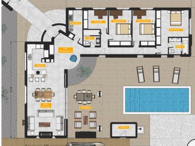 Esta elegante villa de nueva construcción en Polop captura la esencia de la arquitectura ibicenca, combinando paredes blancas texturizadas con cálidos detalles en madera y piedra natural. La vivienda se distribuye en una sola planta para ofrecer la máxima comodidad. El interior destaca por un amplio salón-comedor con vigas de madera vistas y una chimenea integrada, creando un ambiente acogedor y sofisticado. La cocina de concepto abierto está totalmente equipada y se integra perfectamente en el espacio social. Grandes ventanales correderos conectan el interior con una magnífica zona exterior que cuenta con una piscina privada, una pérgola de madera ideal para cenas al aire libre y un jardín de bajo mantenimiento. La propiedad dispone de tres dormitorios, incluyendo una suite principal con baño privado, un segundo baño completo, un estudio independiente y un lavadero. En el exterior, una amplia entrada con pérgola proporciona aparcamiento cubierto, complementado por un práctico trastero.